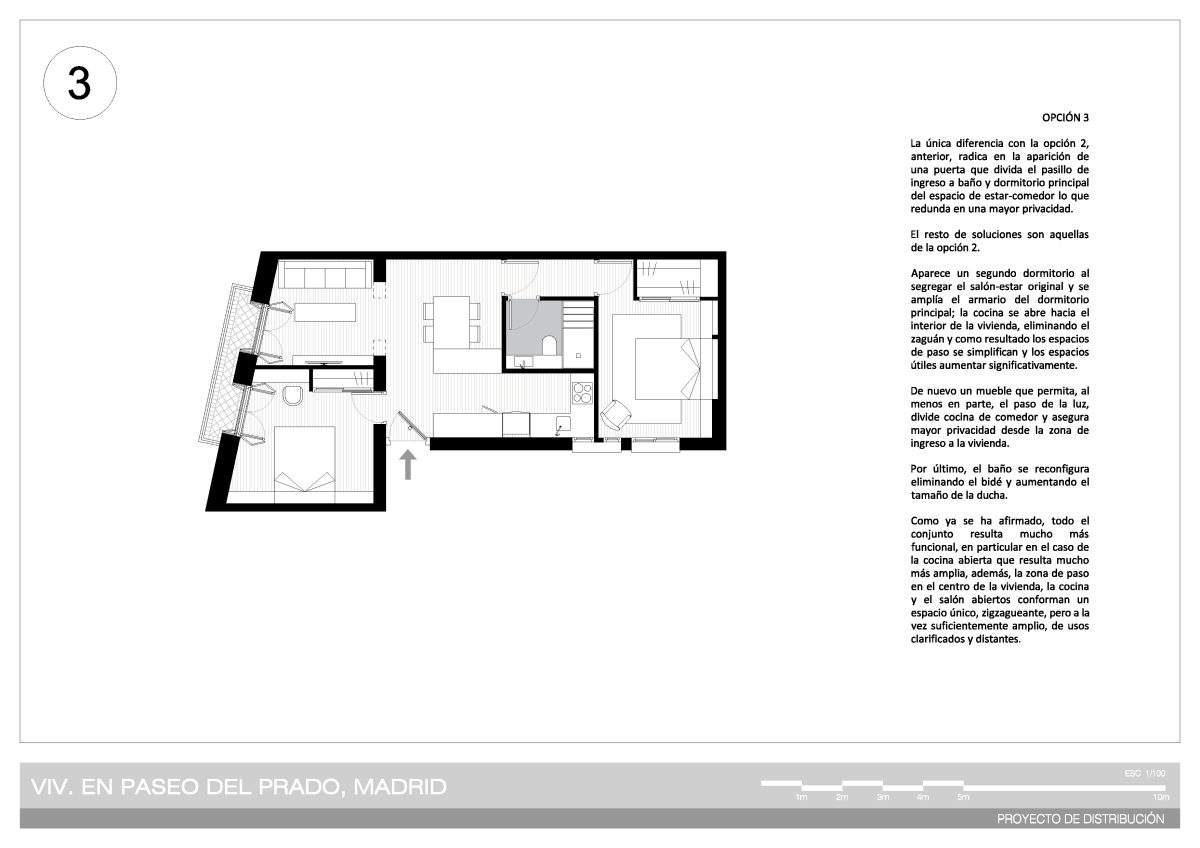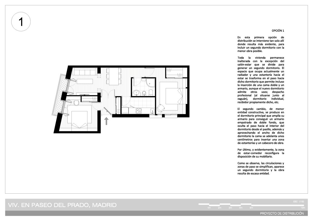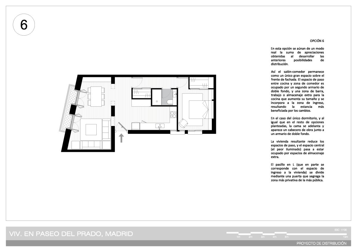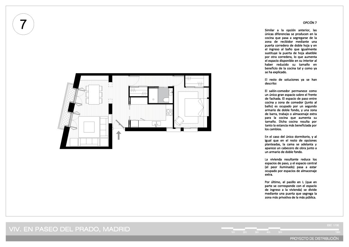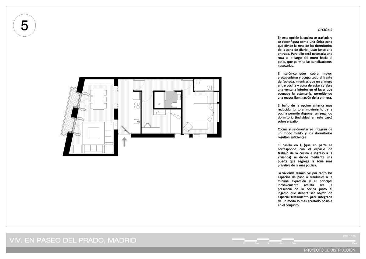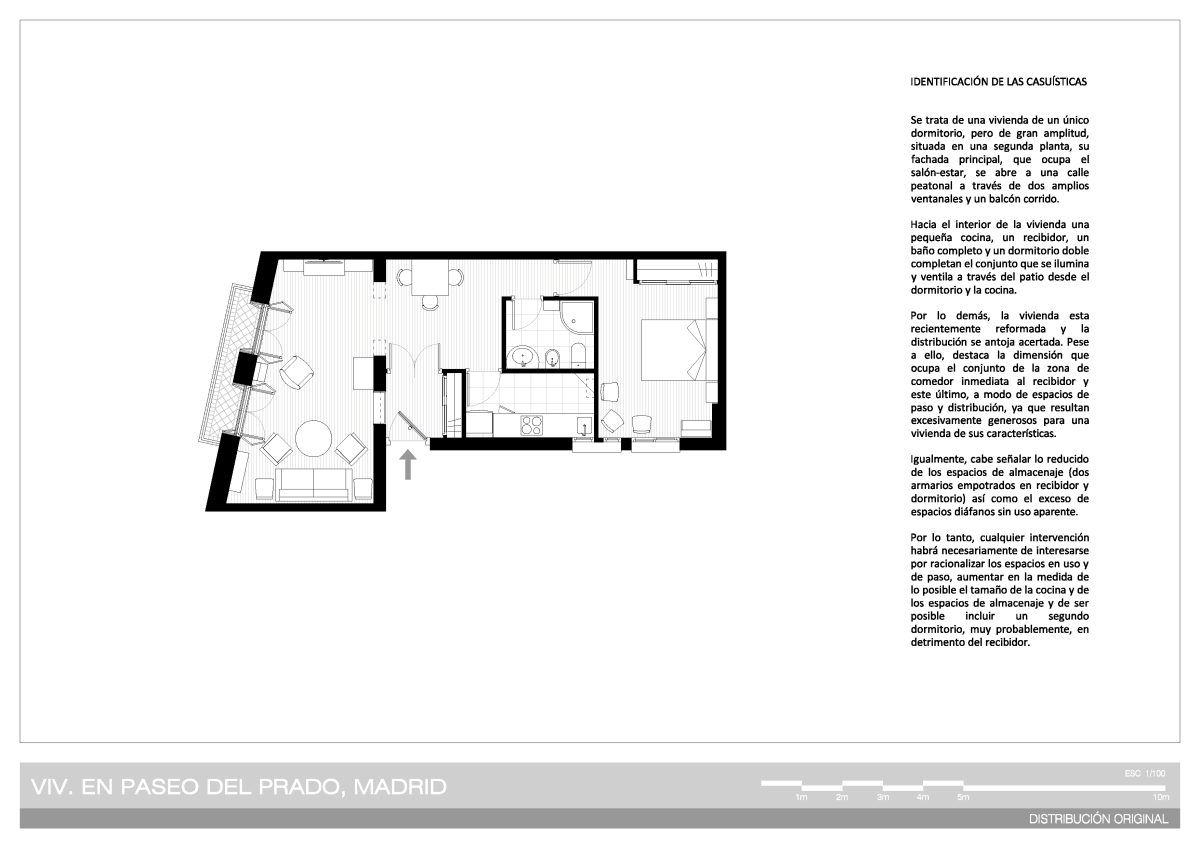 Esta vivienda resulta luminosa, tranquila y silenciosa por sus vistas a la calle posterior que no tiene tráfico; un apartamento que mantiene el aire de los primeros años del Siglo XX y proporciona una distribución óptima del espacio, sin pérdidas, se podría obtener un segundo dormitorio si se incorpora la cocina al salón.