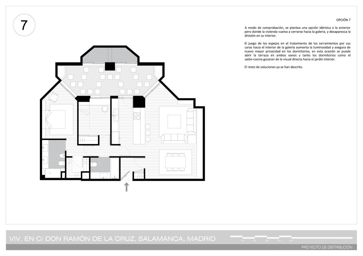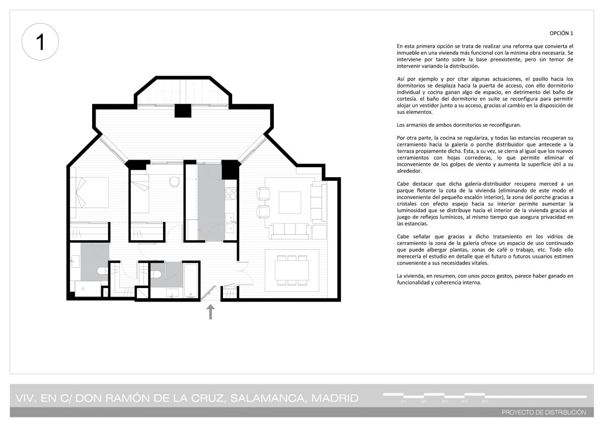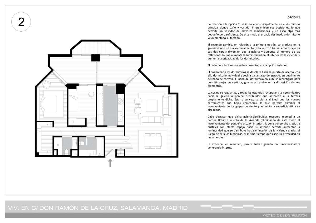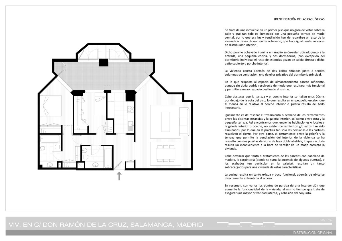Piso en buen estado, 139 m2 distribuidos en vestíbulo de entrada, un gran salón con salida a luminoso patio, dos dormitorios amplios con armarios empotrados, dos baños completos y cocina independiente muy bien comunicada con el salón. Este piso se puede adaptar muy fácilmente a dos dormitorios en suite con baño, o también a un piso familiar de tres dormitorios y dos baños; las separaciones de las estancias están realizadas por medio de tabiquería que permite varias alternatvias de distribución.