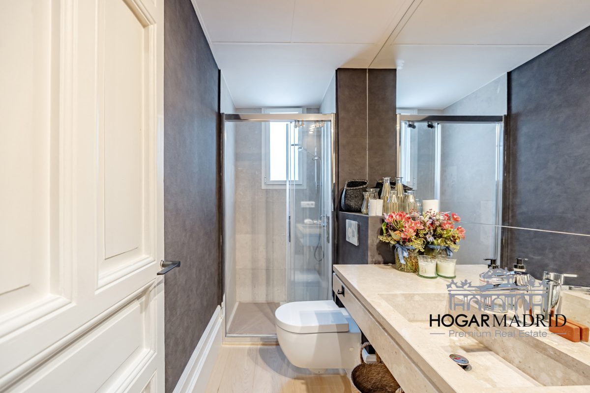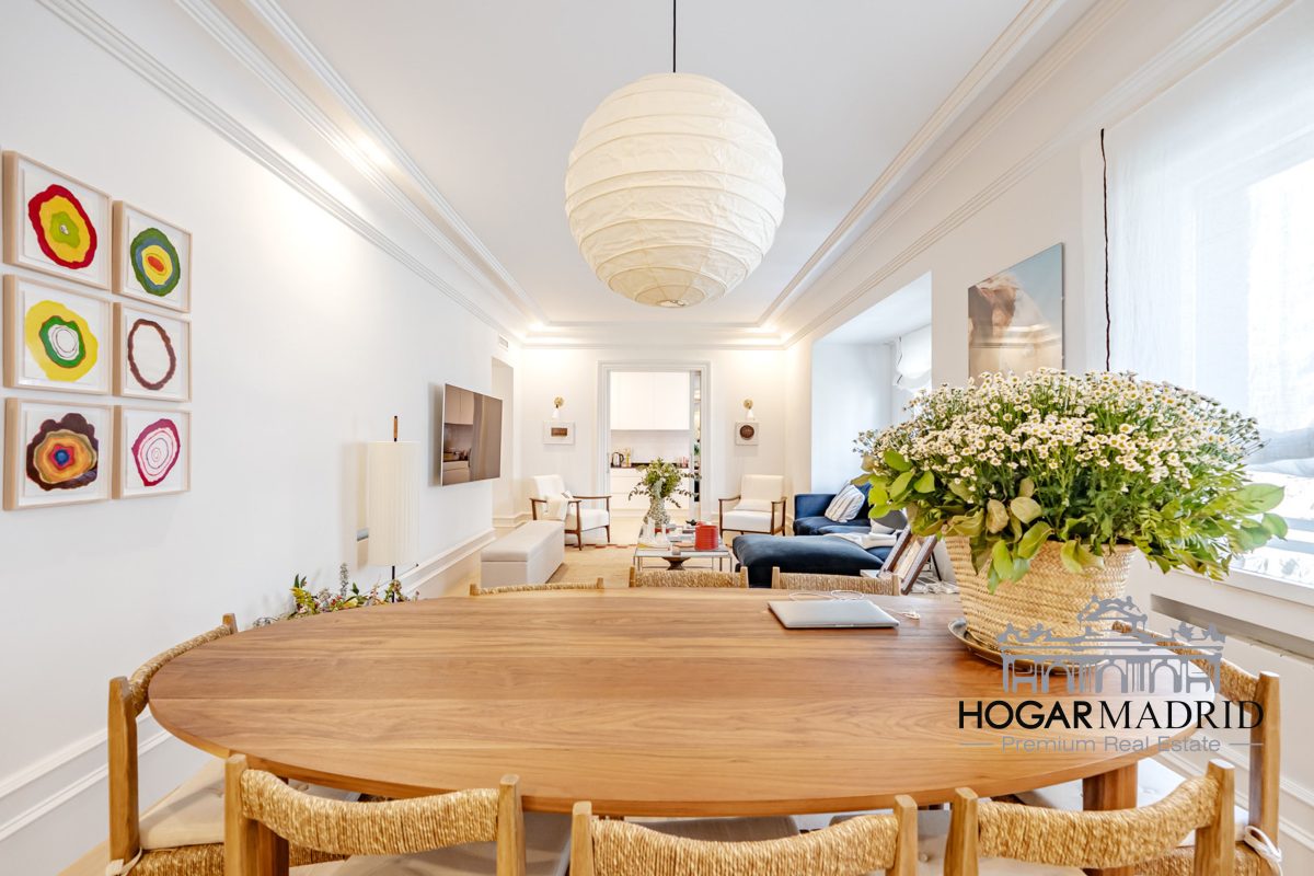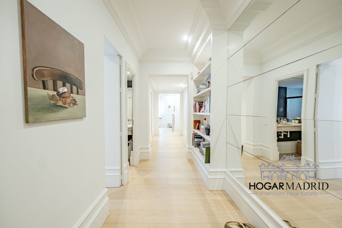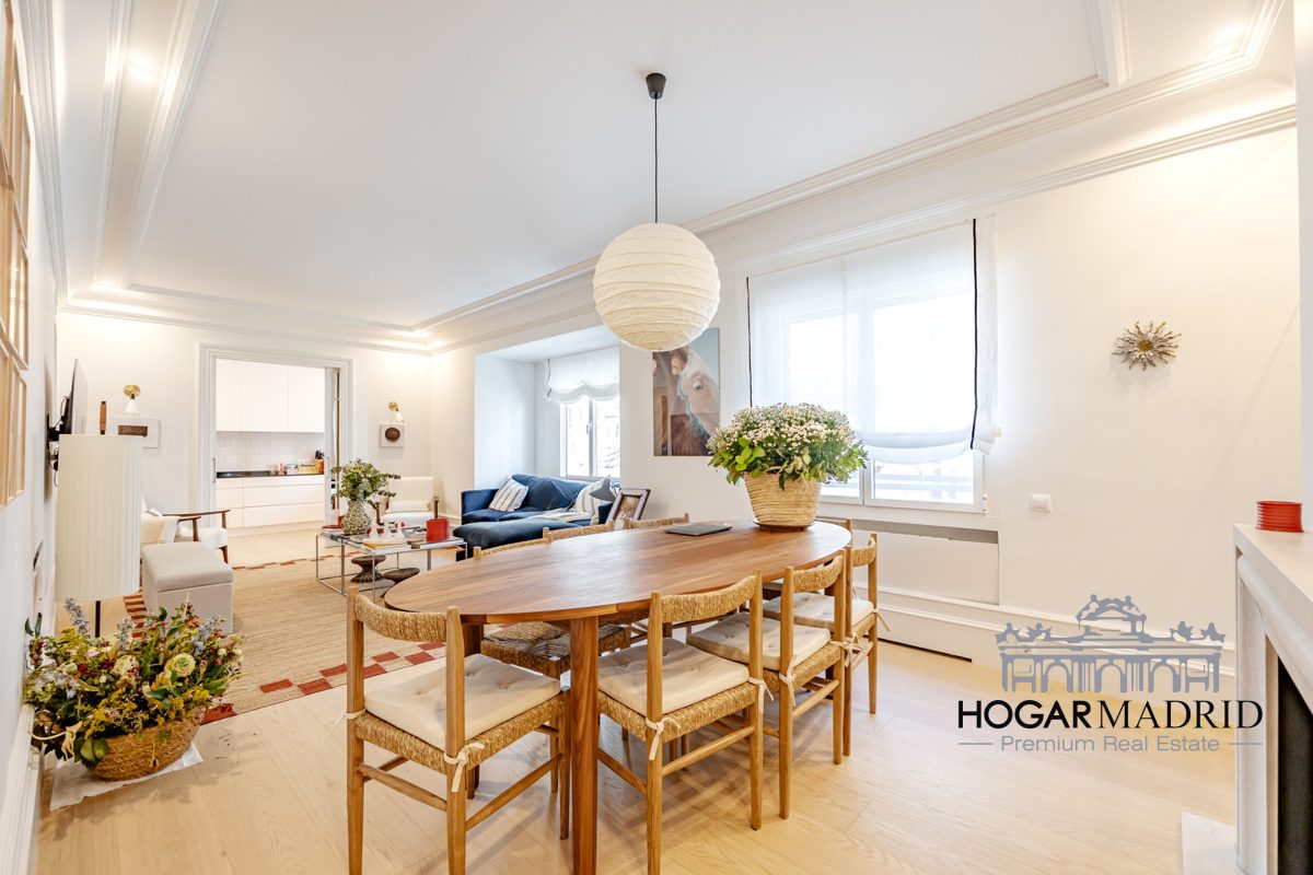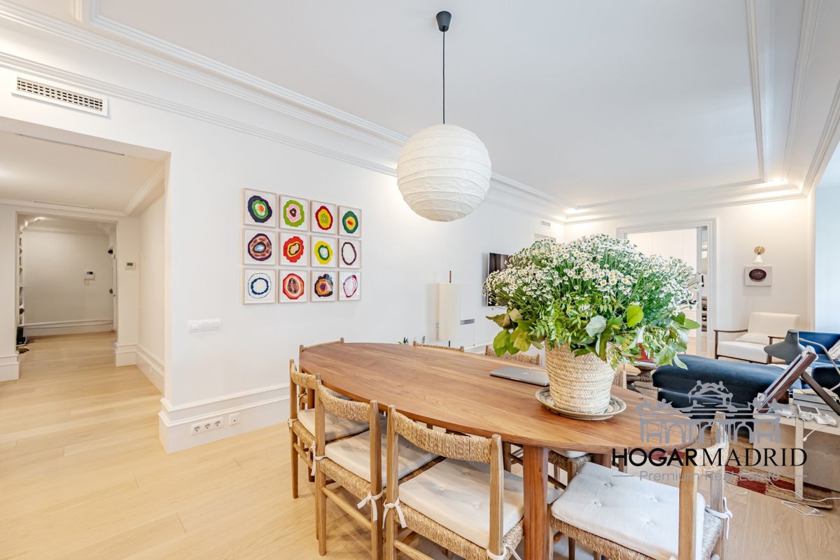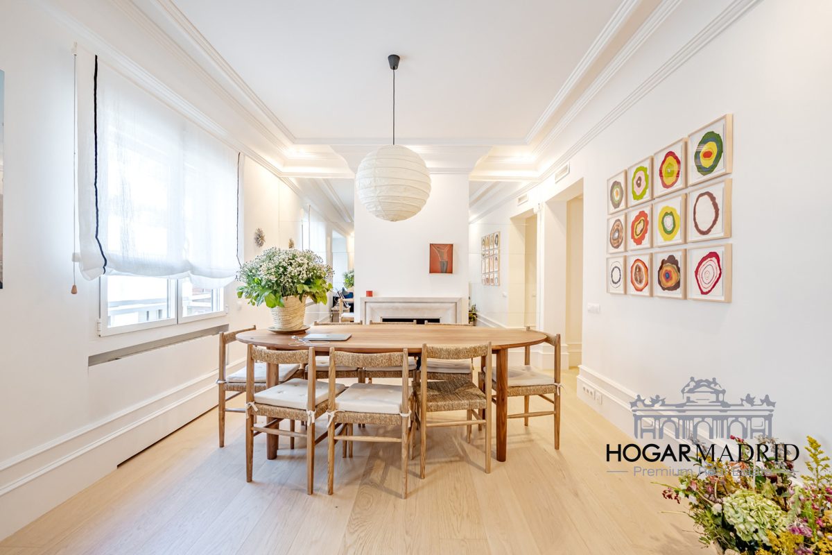 Piso de 147 m2, alto y exterior, se distribuye en vestíbulo, bonito salón en dos ambientes, tres dormitorios amplios con armarios empotrados, tres baños completos y cocina independiente. El salón es amplio y luminoso con dos grandes ventanas orientadas a la calle que definen dos espacios espléndidos de comedor y de sala de estar, comunica directamente con la cocina, independiente, amueblada con mucho espacio de almacenaje y dotada de electrodomésticos de gama alta. Los dormitorios son de muy buen tamaño, cuentan con armarios empotrados y dos de ellos están en suite con baño incorporado, un tercer baño da servicio al dormitorio restante y como aseo de cortesía para el invitados. Es el resultado de una reforma integral de la mejor calidad muy reciente y que ha conservado la personalidad original del piso aportando las comodidades actuales, como es el aire acondicionado en toda la casa por medio de conductos o las dos habitaciones en suite.