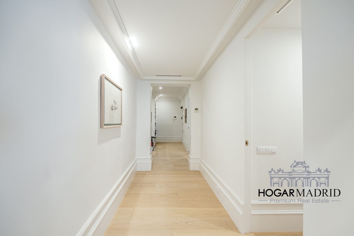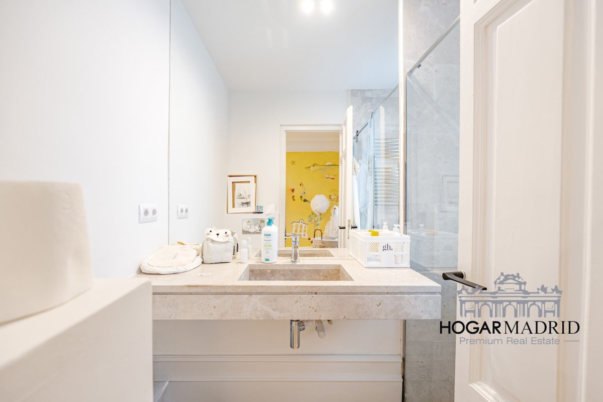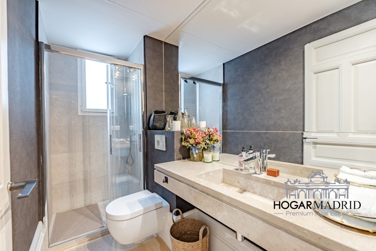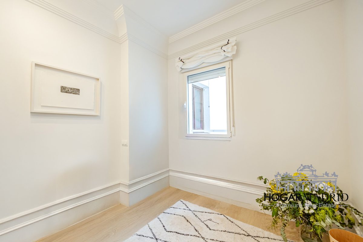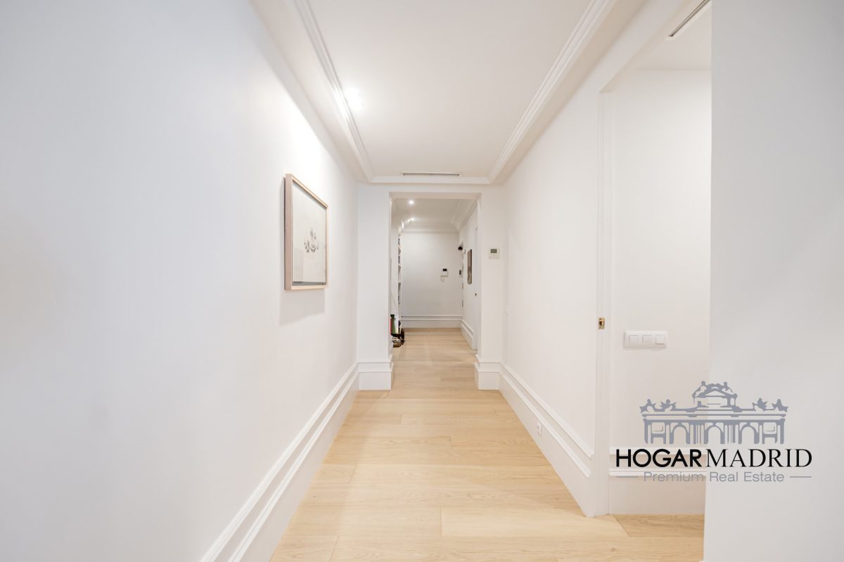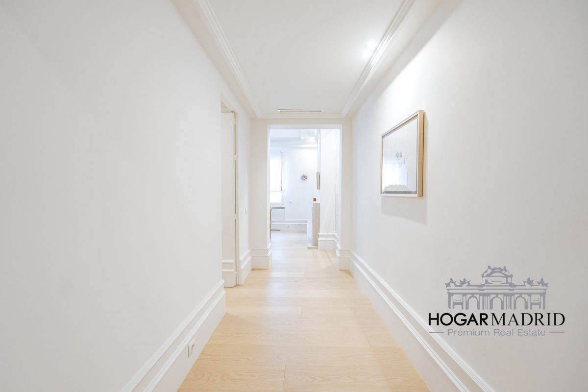 Piso de 147 m2, alto y exterior, se distribuye en vestíbulo, bonito salón en dos ambientes, tres dormitorios amplios con armarios empotrados, tres baños completos y cocina independiente. El salón es amplio y luminoso con dos grandes ventanas orientadas a la calle que definen dos espacios espléndidos de comedor y de sala de estar, comunica directamente con la cocina, independiente, amueblada con mucho espacio de almacenaje y dotada de electrodomésticos de gama alta. Los dormitorios son de muy buen tamaño, cuentan con armarios empotrados y dos de ellos están en suite con baño incorporado, un tercer baño da servicio al dormitorio restante y como aseo de cortesía para el invitados. Es el resultado de una reforma integral de la mejor calidad muy reciente y que ha conservado la personalidad original del piso aportando las comodidades actuales, como es el aire acondicionado en toda la casa por medio de conductos o las dos habitaciones en suite.