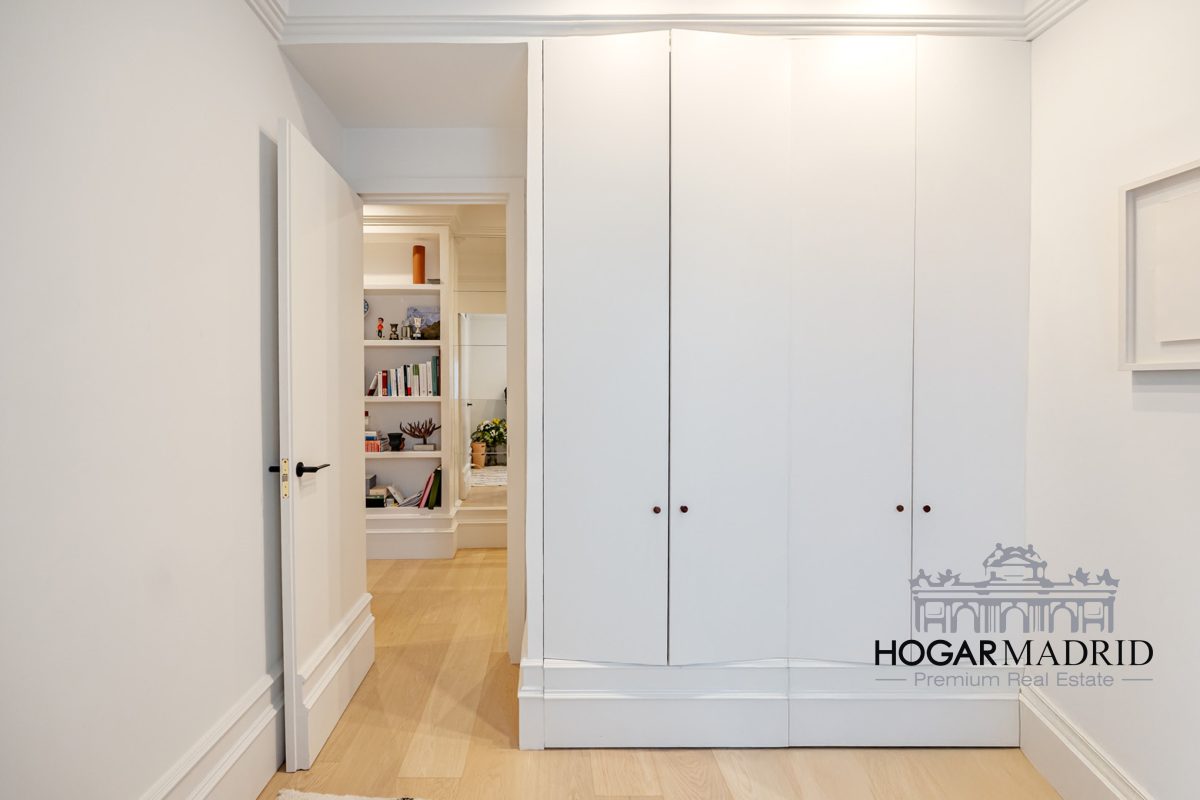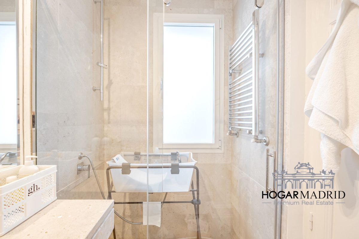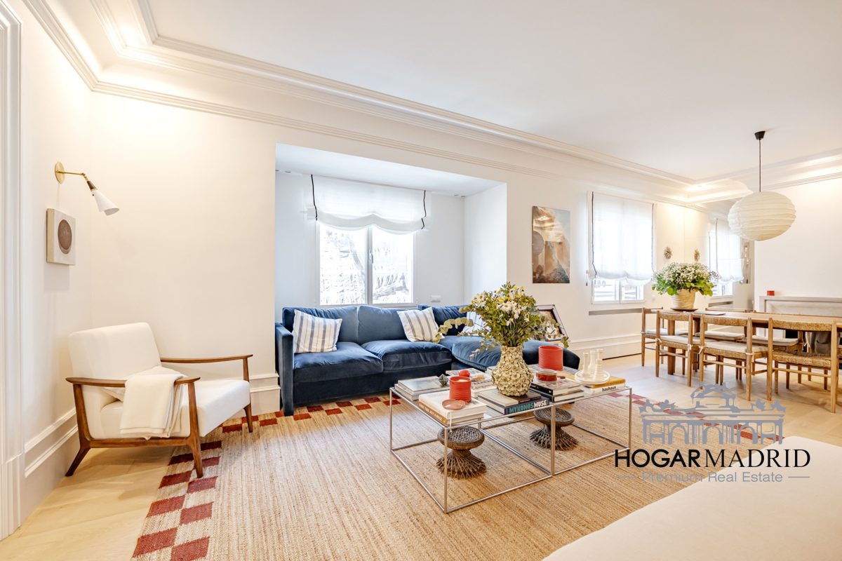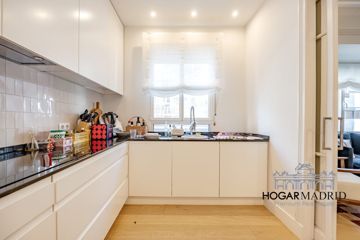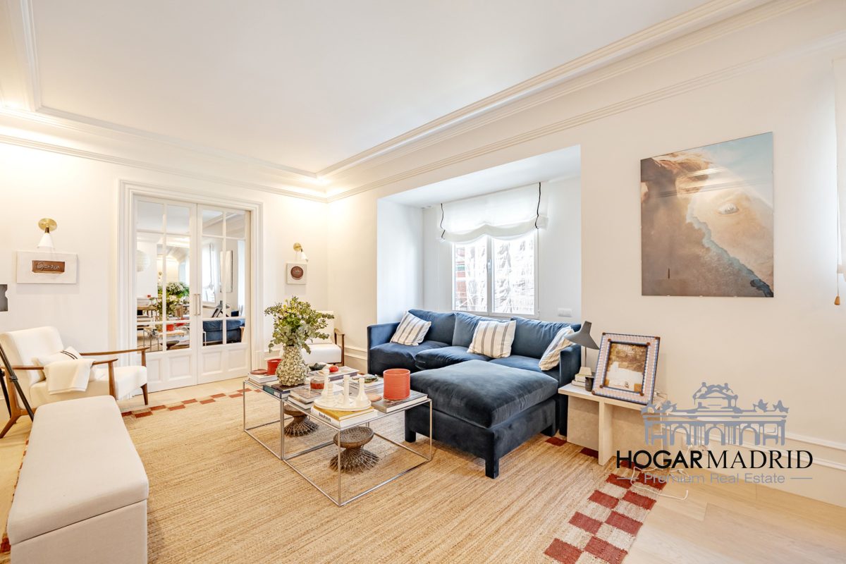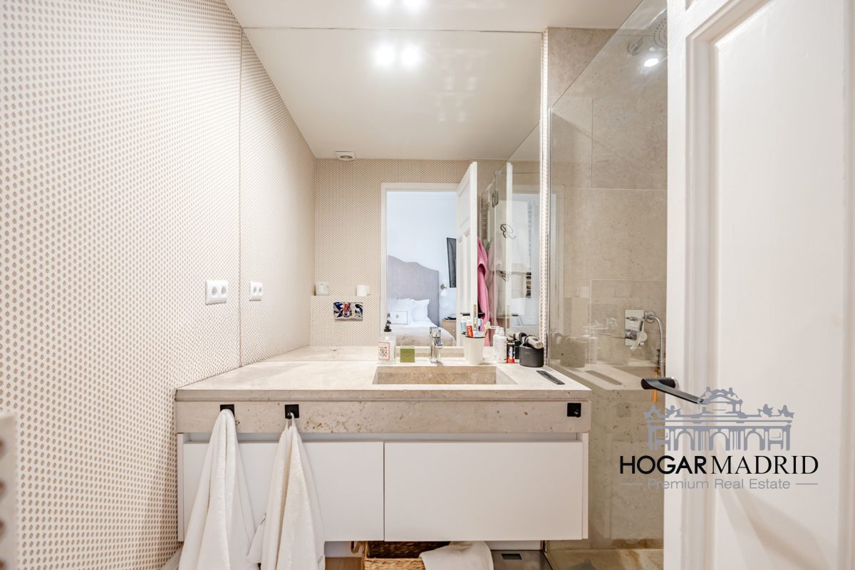 Piso de 147 m2, alto y exterior, se distribuye en vestíbulo, bonito salón en dos ambientes, tres dormitorios amplios con armarios empotrados, tres baños completos y cocina independiente. El salón es amplio y luminoso con dos grandes ventanas orientadas a la calle que definen dos espacios espléndidos de comedor y de sala de estar, comunica directamente con la cocina, independiente, amueblada con mucho espacio de almacenaje y dotada de electrodomésticos de gama alta. Los dormitorios son de muy buen tamaño, cuentan con armarios empotrados y dos de ellos están en suite con baño incorporado, un tercer baño da servicio al dormitorio restante y como aseo de cortesía para el invitados. Es el resultado de una reforma integral de la mejor calidad muy reciente y que ha conservado la personalidad original del piso aportando las comodidades actuales, como es el aire acondicionado en toda la casa por medio de conductos o las dos habitaciones en suite.