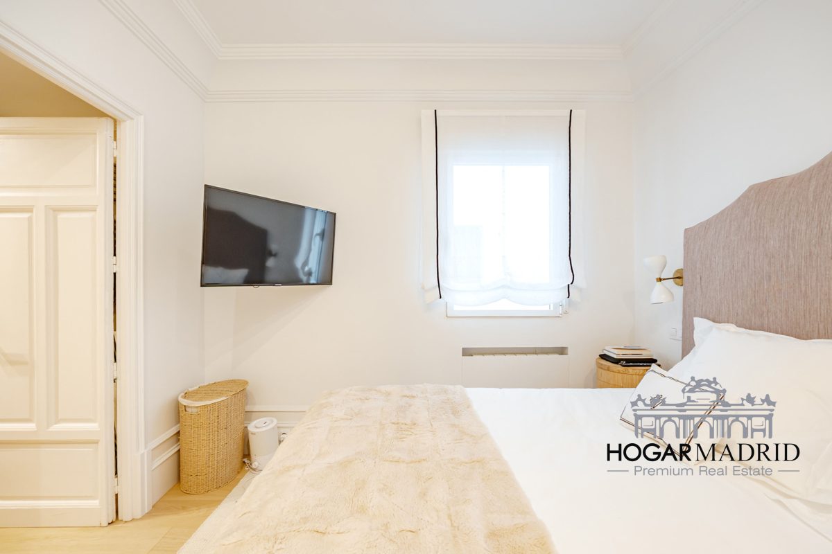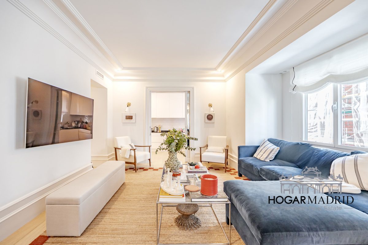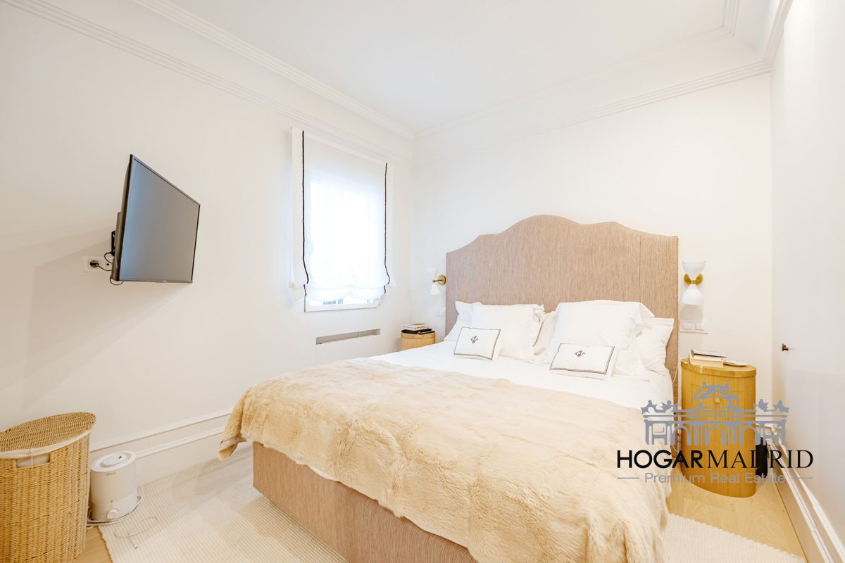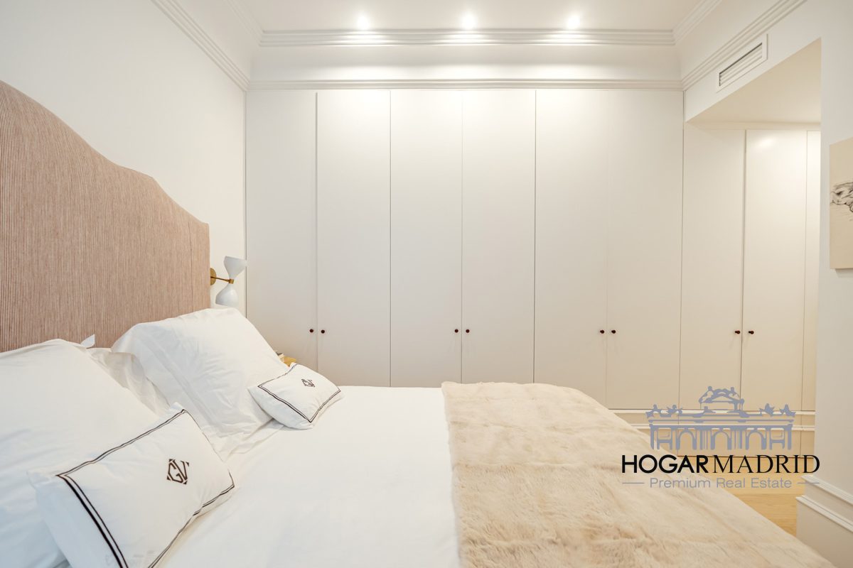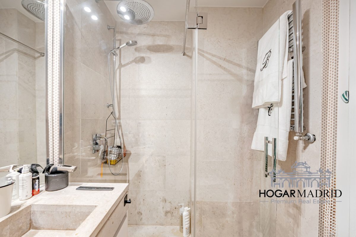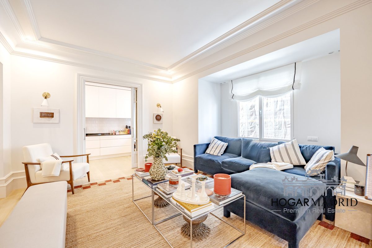 Piso de 147 m2, alto y exterior, se distribuye en vestíbulo, bonito salón en dos ambientes, tres dormitorios amplios con armarios empotrados, tres baños completos y cocina independiente. El salón es amplio y luminoso con dos grandes ventanas orientadas a la calle que definen dos espacios espléndidos de comedor y de sala de estar, comunica directamente con la cocina, independiente, amueblada con mucho espacio de almacenaje y dotada de electrodomésticos de gama alta. Los dormitorios son de muy buen tamaño, cuentan con armarios empotrados y dos de ellos están en suite con baño incorporado, un tercer baño da servicio al dormitorio restante y como aseo de cortesía para el invitados. Es el resultado de una reforma integral de la mejor calidad muy reciente y que ha conservado la personalidad original del piso aportando las comodidades actuales, como es el aire acondicionado en toda la casa por medio de conductos o las dos habitaciones en suite.