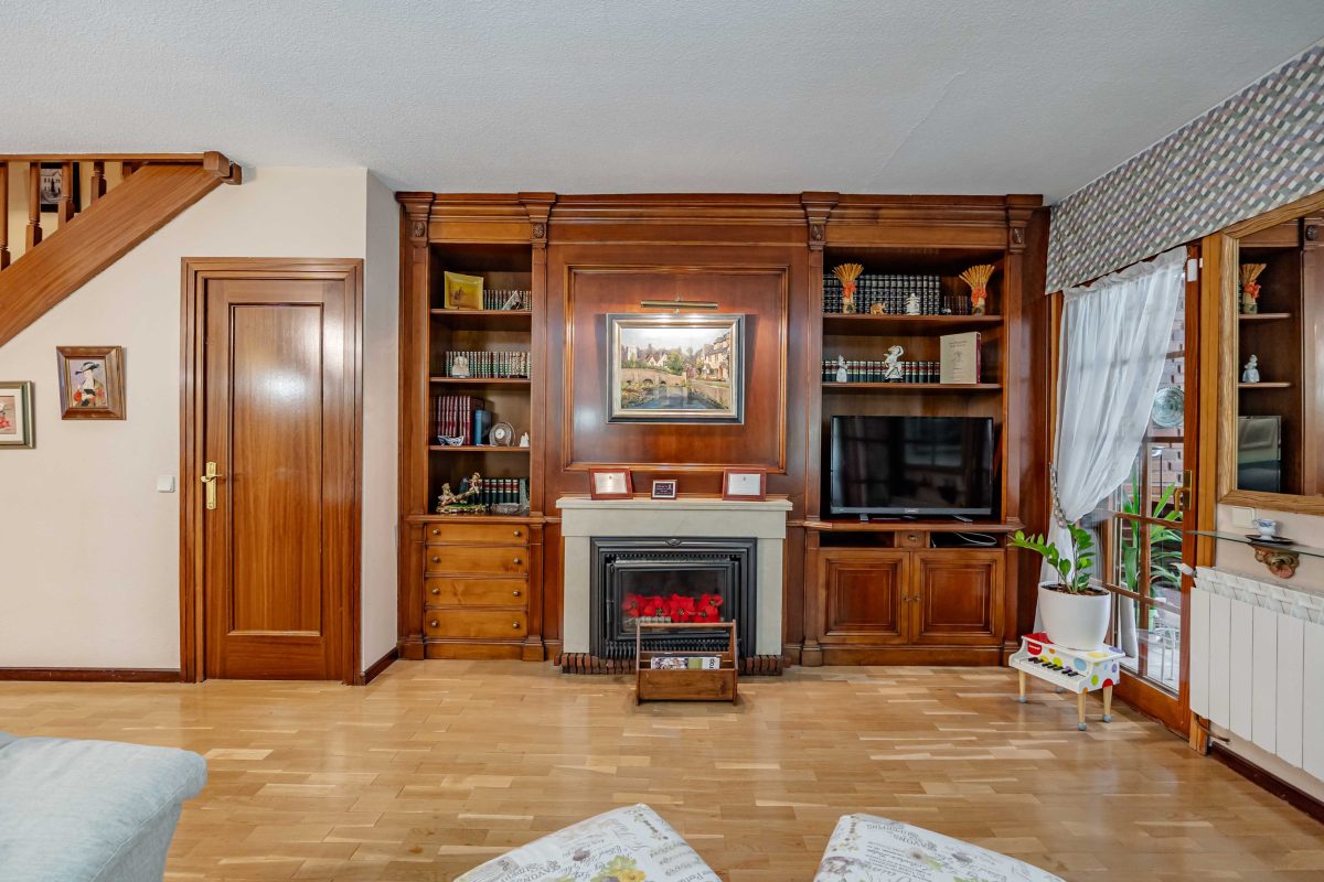 El salón dispone de chimenea, flanqueada por un espectacular mueble encajado a medida, que ocupa todo ese frontal. En otra pared, la estancia cuenta con otro mueble, compuesto de estanterías de escayola, combinada con cajoneras de madera, que brindan capacidad de almacenamiento y detalles decorativos.
